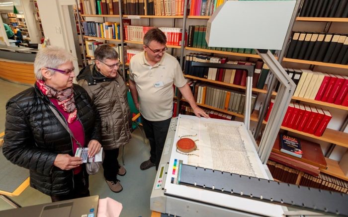 “扫码侠”罗伯特·莱特(右)与档案馆馆长戴维·施努尔博士在施瓦本格明德档案馆利用 Bookeye 3 R1 保护文献
