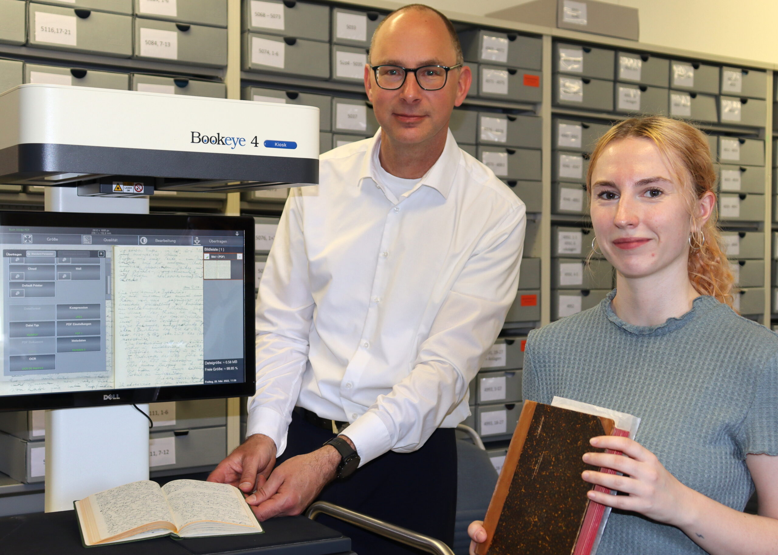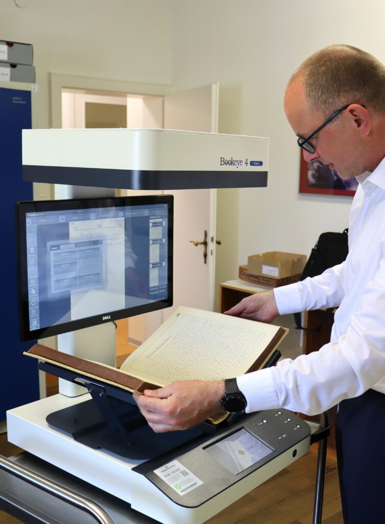 摘录自德国日记档案馆的成功案例,该档案馆从我们西南地区的销售伙伴 Morgenstern AG 购买了一台 Bookeye 4 V3 Kiosk 图书扫描仪:
