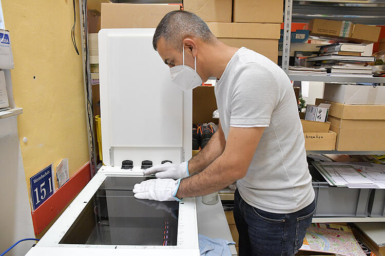 档案工作人员 Zardasht Ahmad 正在使用 WideTEK 12 扫描大约 1,800 张幻灯片。图片:Petra Reith
