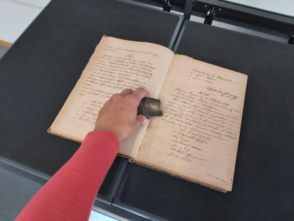 在销售经理曼弗雷德·格兰迪斯(Manfred Grandis)的优质培训和咨询之后,市档案馆的工作人员创建了一个数字化模板,他们能够在一个小时内对一本近200页的书籍进行数字化:每页都以300 dpi的分辨率扫描为PDF/A格式,并留有边缘余量。“在扫描第一个会议记录卷册时,我们翻页时发现,这些书籍在移交给市档案馆之前显然曾存放在一个肮脏的地下室里——因为有细沙不断掉出来……”市档案馆的档案管理助理(FaMI)珍妮弗·巴赫(Jennifer Bach)报告道。这些污垢用乳胶海绵清除,因此该项目巧妙地将数字化与馆藏保护措施结合起来。会议记录卷册在数字化后将专业地包装到档案盒中。