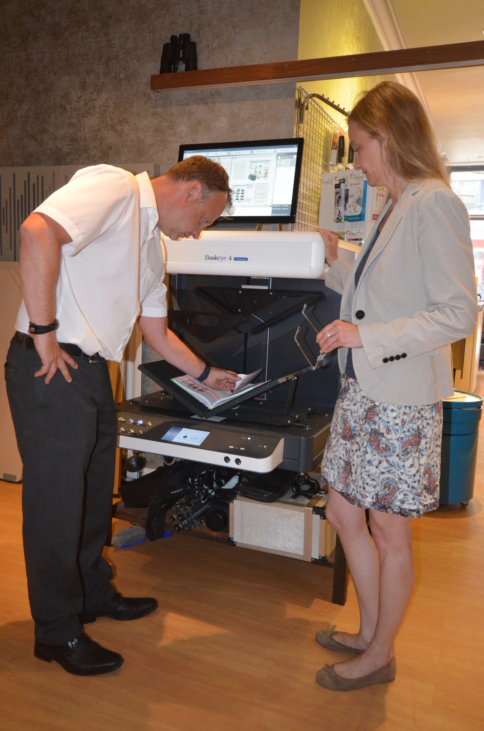 Arcscan 董事总经理 Heiko Paasch 向一位感兴趣的客户展示 Image Access Bookeye 4 书籍扫描仪。