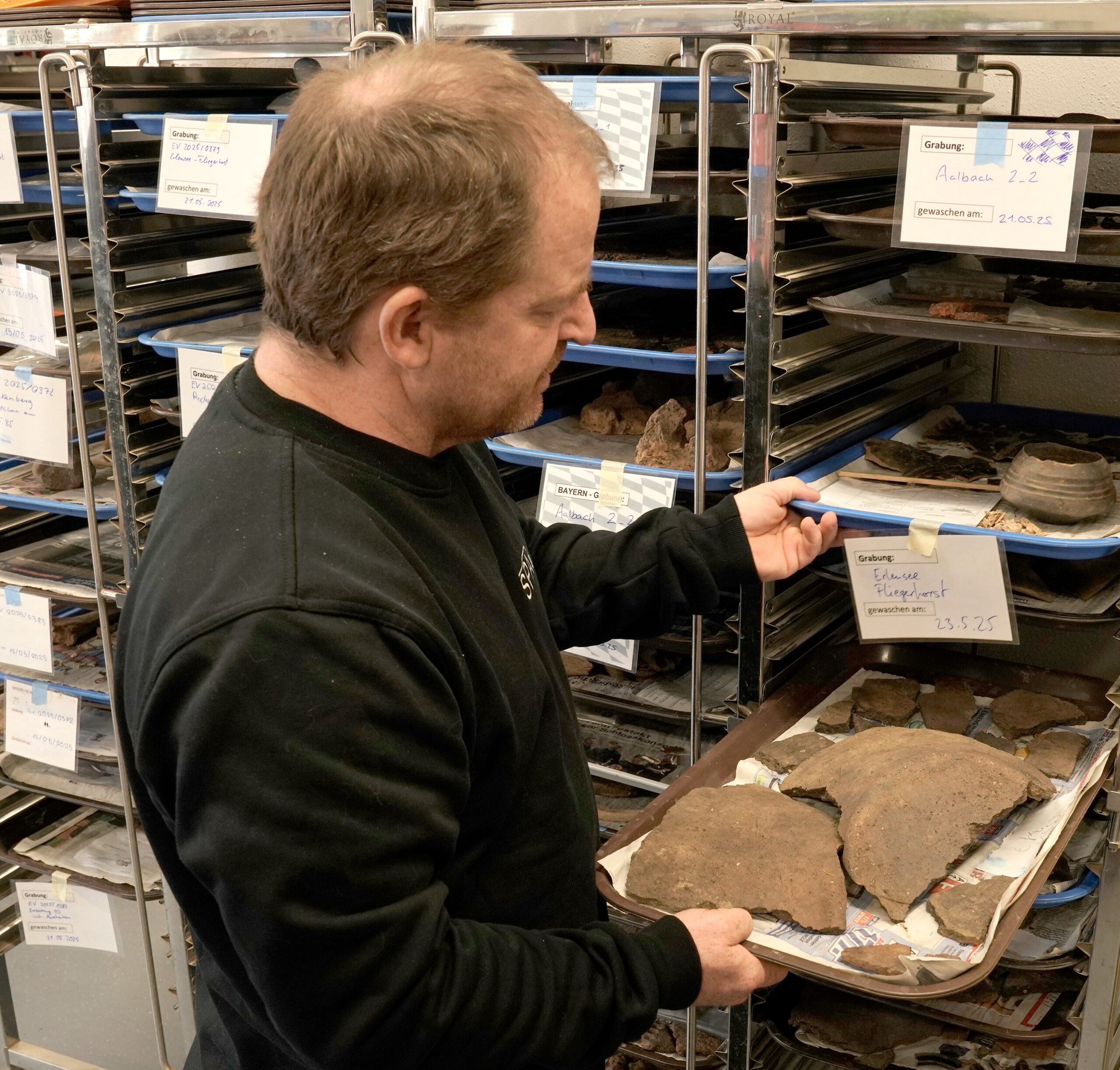 考古勘探,也就是发掘,是对遗迹进行的一种有记录的破坏。我们会移除表层土壤,即不可能存在文物的区域。在这下面就是考古层。这些考古层并不像人们通常认为的那样深。在一片苹果园里,我们只需往下挖五厘米;在耕过的农田里,则需要挖三十厘米。接着我们就能识别出考古发现,例如墙体或墓葬。这些都会被我们进行记录性发掘。我们必须对所有东西进行拍照、测量,在某些情况下还要绘制草图。发现的文物——陶片、骨头、金属制品、玻璃,等等——都会被提取出来。这些物品会被运到我们的工作室,进行编目、清洁、包装,并根据材料类别进行修复处理。之后会送交各州文物保护局,因为通常情况下,各联邦州是这些文物的所有者。