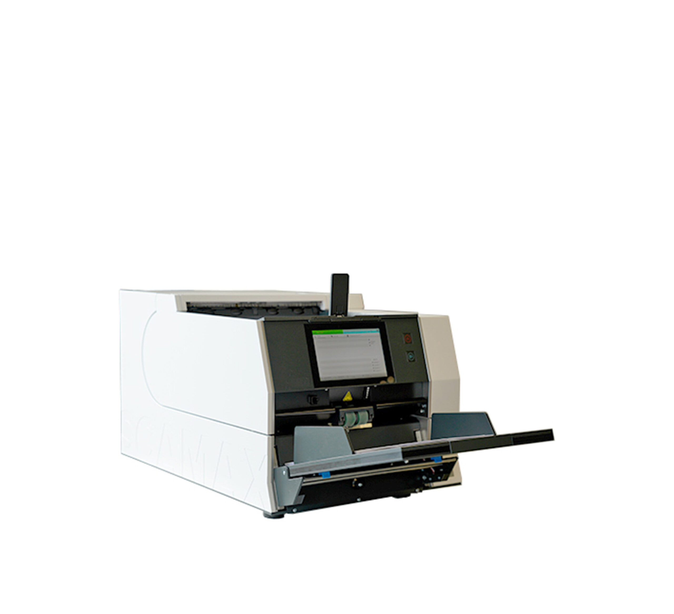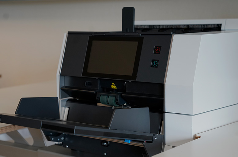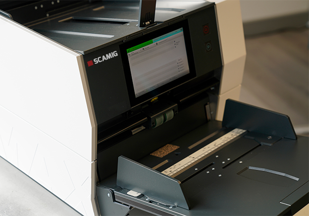 虽然乍一看像打印机,但 SCAMIG 是一款完全专业的生产型扫描仪。单页纸张逐一送入,旋转后自动从顶部托盘输出。对于厚重或损坏的材料,文档可以引导至后部出纸托盘。附加功能——条形码标记识别——可以自动识别和分类文档,确保保持正确的顺序。系统的核心是 7 英寸触摸屏和内置软件——直观、快速且多功能。所有图像处理都在设备内部直接进行,消除了外部处理的需求,并显著加快了整个过程。