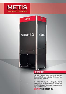 SURF 3D® 是一款革命性的扫描仪,由 METIS 设计和制造,并于 2017 年 11 月在 InPrint 展览会(慕尼黑)上首次亮相。这款扫描仪能够在不到 1 分钟的时间内,从木板、鞣制皮革、面料和纺织品、陶瓷、天然石材壁纸、艺术品等材料中捕获颜色,计算 3D 浮雕和光泽度信息。