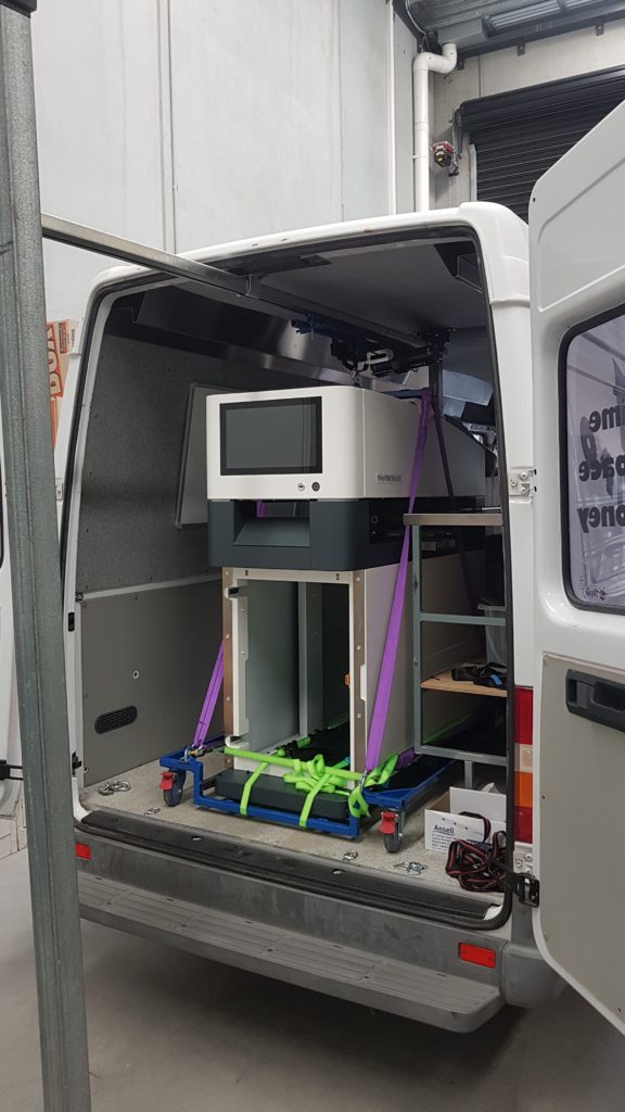 为了Docuvan能够迅速将扫描仪运送到现场并进行设置,他们制作了一个低矮的手推车来承载扫描仪,并在梅赛德斯货车的后部安装了一套升降解决方案。手推车安装好后,扫描仪通过手推车四个角的4个吊耳被吊起。扫描仪被吊高后,沿着车顶轨道向前滑入货车内。然后被放下并固定在货车中。现在,Docuvan抵达一个画廊后,可以在1小时内完成扫描仪的设置、校准并投入使用。在活动或租赁期结束时,扫描仪可以在45分钟内拆卸并重新装回货车,准备运输。